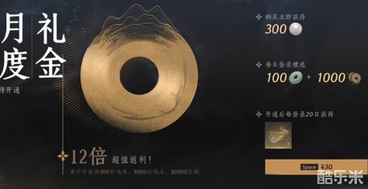 燕云十六声的月卡售价为30元,购买后立即获得300长鸣珠。长鸣珠是游戏中的高级付费货币,主要用于购买限定服饰和特殊道具。每日登录还能领取100长鸣玉和1000宝钱,这些资源在游戏中的用途各不相同。