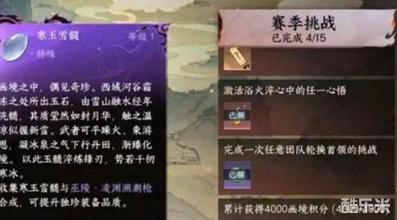 3.菜单-副本-【燃心画境】通关几次完成赛季挑战(领取 武器加工材料 寒玉雪髓),时间多的可以刷刷难度,难度高的箱子奖励丰厚,人机目前只能刷到难度3,组队可以刷难度四以上,开箱子建议开难度四以上