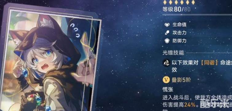 而要说最强力的,那必然还是她的光锥技能慌张,它可以在装备者进入战斗后,使我方全体成员造成的击破伤害提高。在叠影1阶时,这个增伤数值还是16%,而随着叠影提升,在叠影5阶时将能达到24%。