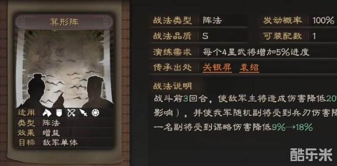 三国志战略版箕形阵这个战法实际上在S5版本,就是专门克制锋矢阵的,甚至是主将主C的战法。它并不算是父女枪的专属战法,因为父女枪给关羽带箕形阵的效果,不一定会比给关羽带一个千里走单骑来的更加强大。当然千里走单骑造价昂贵,所以一般还是以箕形阵为主。箕形阵的效果是,开局三回合会让对手主将的输出降低,且受额外的武力值影响。下面和酷乐米小编一起来看看吧