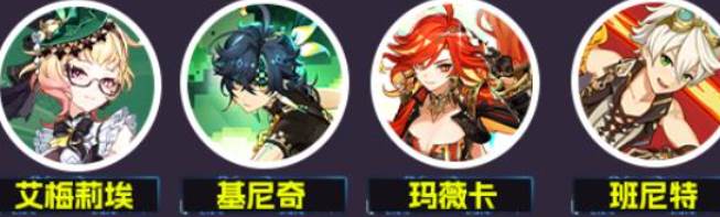 1、阵容构成:艾梅莉埃(草C)+ 基尼奇(火C)+ 玛薇卡(火辅/增伤)+ 班尼特(加攻/治疗)。