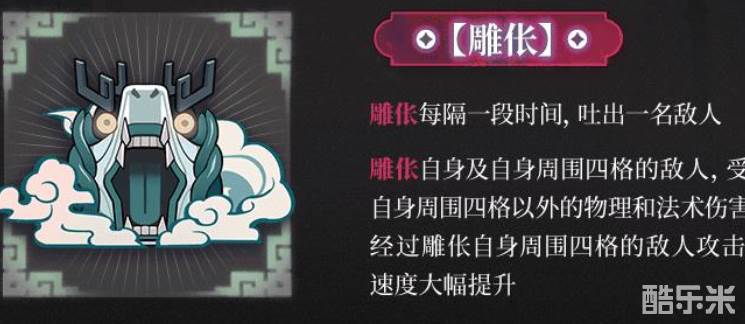 雕化自身及自身周围四格的敌人,受到来自雕作自身周国四格以外的物理和法术伤害降低75%经过雕伥自身周围四格的敌人攻击速度和移动速度大幅提升