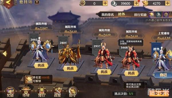 1、【竞技场】每日有5次挑战机会,点击挑战进入布阵界面,少年可以根据对手不同的等级、阵容、阵型来针对性的上阵自己的主将。