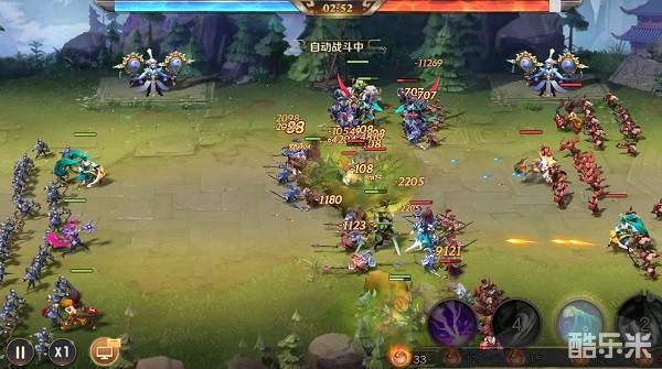 2、竞技场战斗为自动战斗,左下角的暂停键点击之后可以呼叫出菜单进行特效上、音效上的设定,调整战斗速度的按键也同样在左下角,上方的红、蓝色血条可以展示双方当前的实力对比,可以更加容易的洞悉场上的形式