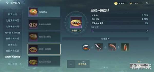 军曹鱼11,9低获取,大虾10,8低获取,这两样是做酸菜鱼的材料+17料理。