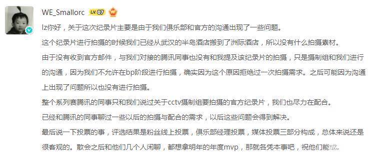 关于官方S7纪录片30分钟WE镜头仅有50秒一事,现在无论贴吧还是微博都闹得沸沸扬扬,而昨夜该纪录片的负责人给出回复。