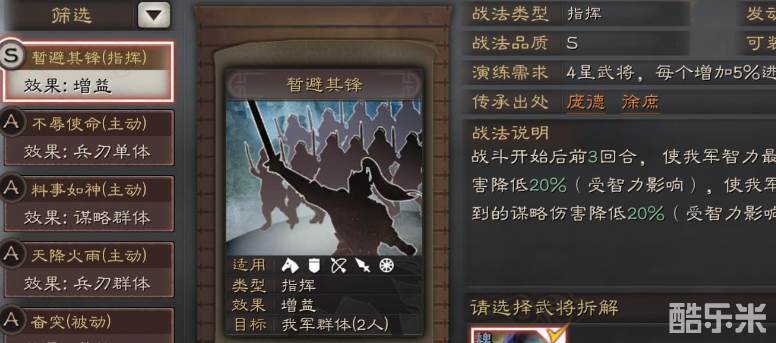 之前的孟获有段时间被加强了,我们也可以把蛮族沙摩柯跟它搭配使用,战法选择刚勇无前、火炽原燎就好。跟祝融搭配使用时,祝融的战法要用破阵摧坚和箕形阵,跟兀突骨搭配选择战法草船借箭和独行。
