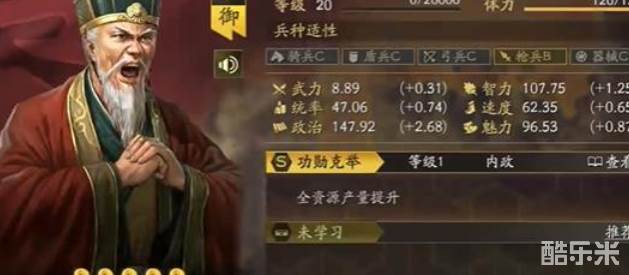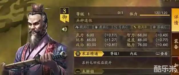 安排他担任采石官,这样能提高石料屯田的收益,对于前期资源紧张的阶段帮助很大。他的自带战法采石精通效果简单直接,委任后能让石料采集效率提升2%,虽然数值不高但胜在稳定。需这位武将的政治属性有80点,在三星将里算不错的基础值。