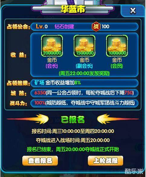 我们都知道,地图上的占领效果都会因为所占领的城池不同而获得不同的资源。占领华蓝市之后,会长会在每周五获得2000000个金币,副会长获得1500000个金币,会员也会得到1000000个金币。