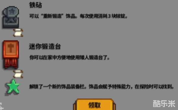 除了蜥怪的爪子和魔法发胶,其它饰品都可以通过它来重置属性,每次重铸需要耗费三个铱锭和游戏里十分钟的时间。仙女盒召唤出的仙女一共有五个等级,可以通过铁砧来重塑等级,级别越高治疗间隔越短,治疗能力越强,重铸到的几率越小。其中,级别一的仙女治疗间隔为四点七秒,治疗能力为80%,重铸到的几率为33.66%。