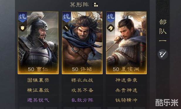 队伍里面乐进提升的先攻属性完美适配夏侯渊,靠先攻增加武力以及增伤的能力,再加上马腾再一次为夏侯渊增伤,能把夏侯渊的伤害抬到一个非常高的水平。战法我们是给乐进带战八方加无奈之志两件套,马腾则是挫锐折锋和舍生取义,夏侯渊带铁骑横冲和兵贵神速。加点方面也很简单,我们给乐进点成一速,让他能先手挂上增伤和连击率,夏侯渊二速,马腾全统率。