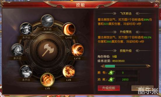 每位玩家的角色所拥有的技能是相同的,考验玩家养成的维度主要在于提升技能的等级。提升技能的材料主要来源于完成任务获得的奖励——潜能值,通过消耗潜能值来升级技能。