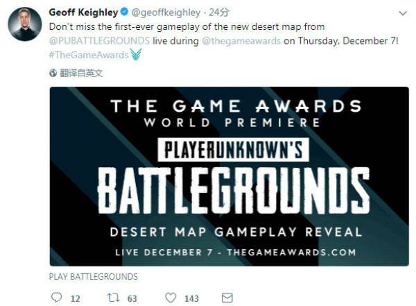 今日,TGA创始人Geoff Keighley在推特上表示,在今年的The Game Awards颁奖典礼上,将会有全球首次的《绝地求生》沙漠地图实机演示,届时我们将一窥蓝洞这张新地图的魅力。
