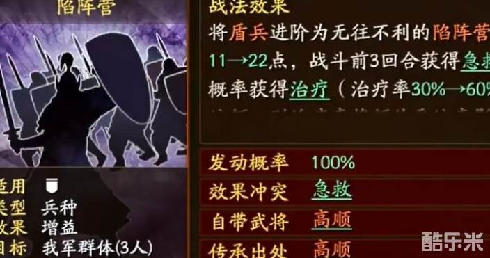 该战法需通过拆解武将高顺获取,其治疗量受智力影响,若由高顺统领则额外受统率加成。陷阵营的战术定位在于通过属性强化和续航能力延长战斗回合数,尤其适合以物理输出为主的盾兵阵容,注意其治疗效果存在随机性,且对禁疗类战法较为敏感。