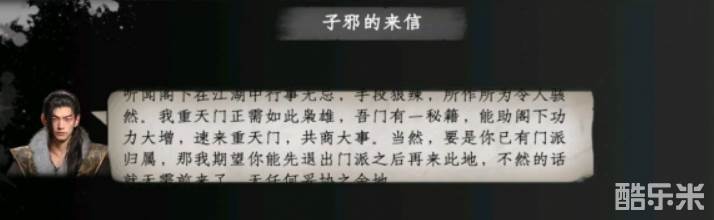 当你的道德值低于50时,你就有机会接到来自子邪的飞鸽传书,告诉你可以加入重天门。你只需要去到指定的地点与子邪对话,接受他的邀请即可。