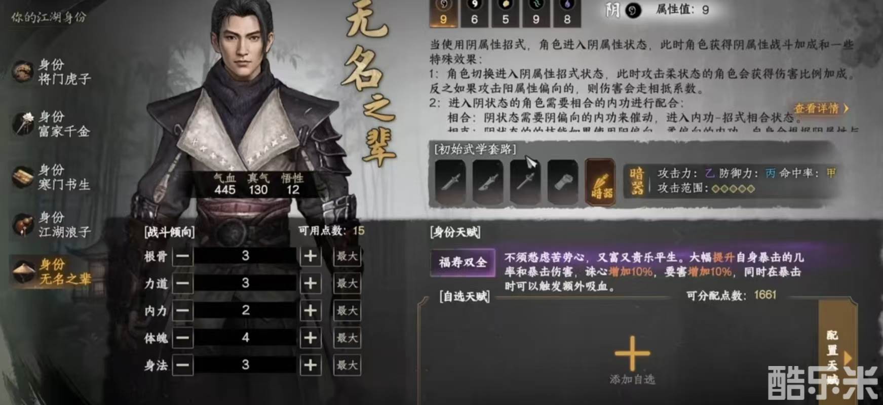 游戏的角色成就目前有五种身份可以选择,分别是将门虎子、富家千金、寒门书生、江湖浪子、无名之辈。每一个身份对应不同的剧情。新手建议先从将门虎子的剧情开始玩,难度呈梯度上升,上手更容易。人物自身的成就是指玩家在游戏里通过打造武学体系、锻造装备等提升实力来达成成就,比如说用将门虎子的身份,当根骨达到250点后,就会解锁成就,这个成就会产生一个天赋点。其他类型的成就同理,总之就是跟角色相关的属性成长到一定阶段,就会解锁成就。