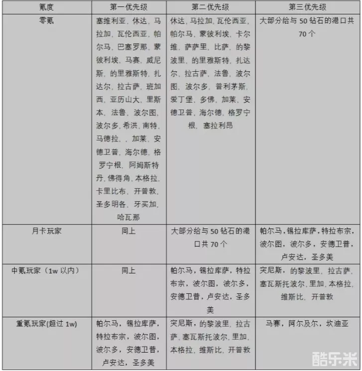 零氪玩家因为资源少,所以我们需要在投资港口的时候要优先获得给与资源奖励的城市,主要就体力,经验书,钻石。作为一个零氪玩家,我们的体力肯定是不够用的,只需要30w海币就可以获得体力的投资奖励当然是我们的第一优先级。技能经验书可以帮助我们提升取引,更快的获取海币,或者提升海事,冒险技能更高效的练级或者进行转职。尤其某些技能实在不适合手动升级,经验书的目的就在于此了。所以每个港口只需要投资180w海币就可以获得的技能经验书就是我们的第二优先级。最后就是钻石了,钻石就不需要多说了,每个港口1000w投资就能获得50钻,共70个港口,总共可以获得3500钻,对于零氪玩家而言可是一笔不小的财富了。