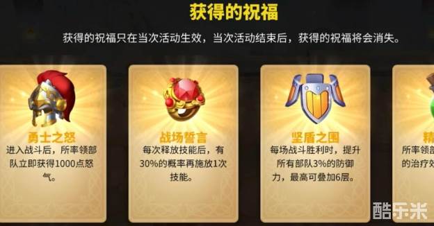 黄金之国活动中最关键的两个buff是无边号角和百战之怠,前三关必须刷出号角、慷慨或百战不殆中的橙色祝福。第五关可退回第四关刷新祝福,优先选择减伤、生命、防御类增益,步兵类祝福和援军是首选。围绕慷慨战术展开的拖延战术是核心思路,战斗时间越长回血效果越显著。