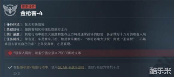 【任务目标】:在任意机密/绝密行动中,使用【SCAR-H战斗步枪】,击败3名敌方特战干员;