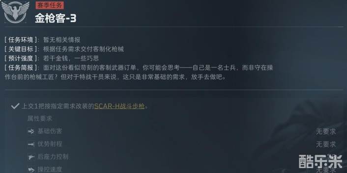 三角洲行动S5金枪客3怎么改,金枪客3任务需要上交3把按指定需求改装的【SCAR-H战斗步枪】,对【属性要求】:后坐力控制:≥77;据枪稳定性:≥64;但对改装的基础伤害、优势射程、腰际射击精度均无要求;下面和酷乐米小编一起来看看吧