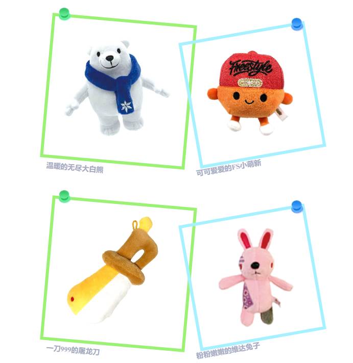 放心,都替你们准备好了!我们特意为这款TONG包准备了四款可爱的谷子:温暖的无尽大白熊、可可爱爱的FS小萌新、一刀999的屠龙刀、粉粉嫩嫩的维达兔子。