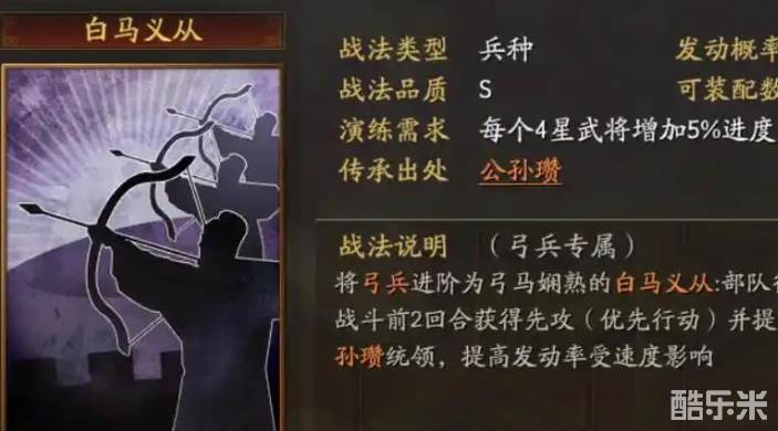 三国志战略版常用的特殊弓兵有三个,其中强度最高的是白马义从,它是公孙瓒的传承兵种战法。玩家可以把公孙瓒拆掉换成白马义从,这样就能让其他武将也用上这个特殊兵种。也可以不拆让公孙瓒上阵,这样可以触发白马义从的额外效果。带上白马义从这个战法后可以把我方的弓兵变成白马义从,这样弓兵队伍的行军速度会提升。另外我方在前两回合里还可以获得先攻效果,先攻让我方可以在敌人之前优先行动。下面和酷乐米小编一起来看看吧