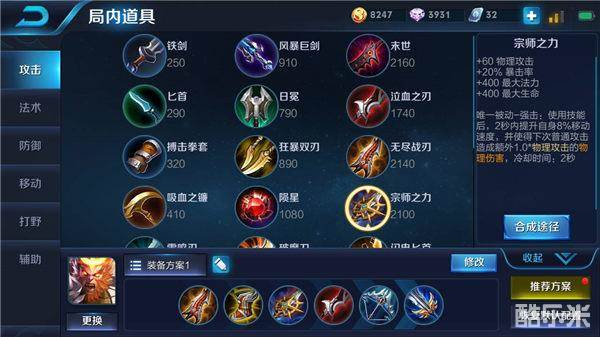 第一件做出无尽战刃,无尽战刃所提供的高额攻击力以及暴击几率使孙悟空的爆发伤害得到了质的飞跃,并且其提高暴击伤害的被动效果使孙悟空的伤害输出再次得到强化。第二件做出疾步之靴,这件装备为孙悟空提供了高额移动速度,这使得孙悟空游走能力以及支援能力得到最大程度的提高。第三件做出宗师之力,这件装备所提供的各项属性使孙悟空的综合作战能力得到全面的提升,并且其提供的使用技能后下次普通攻击造成额外伤害的被动使孙悟空的伤害能力再上一层楼。第四件做出泣血之刃,泣血之刃为孙悟空提供了高额攻击力以及物理吸血,这使孙悟空的持续作战能力大大提升。第五件做出破甲弓,破甲弓所提供的攻击力以及高额护甲穿透,这使孙悟空在遇到敌方坦克时也能轻易将其重创。最后一件做出破军,这件装备所提供的高额攻击力以及其对生命值低下的目标造成额外伤害这一被动,大大提高了孙悟空的伤害输出以及其收割能力。