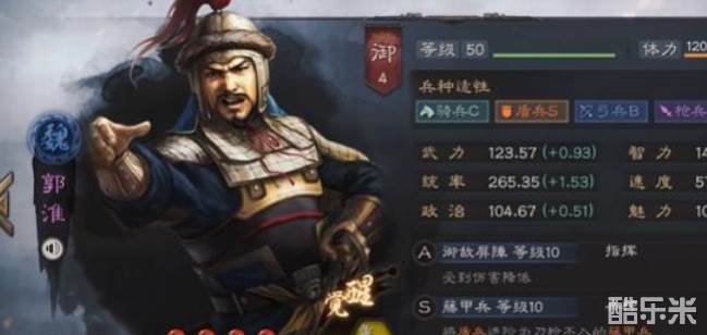 郭淮是乐进最常见的四星搭档之一,其自带战法御敌屏障能提供前四回合的群体减伤,显著降低乐进被集火的风险。作为盾兵A适性武将,郭淮在开荒阶段可与乐进组成低统御值的混编队伍,例如乐进(骑兵)+郭淮(盾兵)+张飞(枪兵)的5+4+6统御组合,仅需6级君王殿即可成型。郭淮的防御属性和战法可弥补乐进统御成长不足的缺陷,适合前期快速抢占资源地。