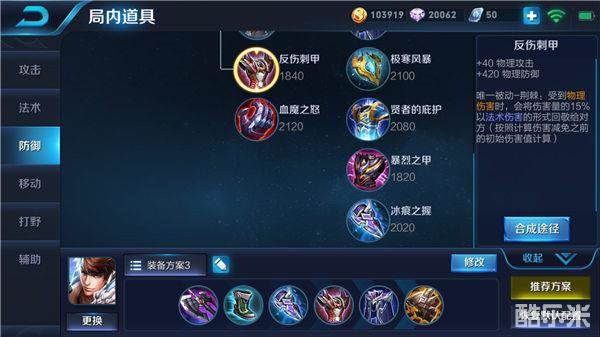 六神装:暗影战斧、抵抗之靴、冰痕之握、反伤刺甲、魔女斗篷、不祥征兆