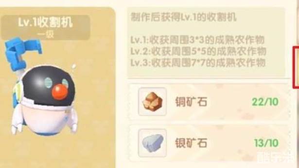玩家需进入游戏内的店铺界面,找到机器制作店选项,选择收割机并查看所需材料清单。制作基础收割机通常需要铜矿石和银矿石各10个,部分高级型号可能额外需要其他资源,建议提前通过采矿或任务积累足够材料。