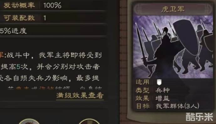 虎卫军的经典搭配为曹操、典韦、许褚组成的虎卫神威缘分阵容。曹操作为主将携带守而必固、刮骨疗毒,利用嘲讽强制触发虎卫军反击,同时通过乱世奸雄提升副将伤害并降低自身受损。典韦需全武力加点,配备气凌三军、后发制人形成多重反击链,配合自带战法古之恶来为主将承担伤害。许褚则选择短兵相见、不辱使命等战法,利用虎卫军加成的武力快速压制敌方血量。该阵容优势在于稳定的反击输出和曹操的续航能力,但惧怕高谋略伤害队伍与火攻。