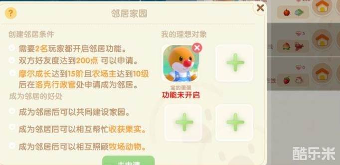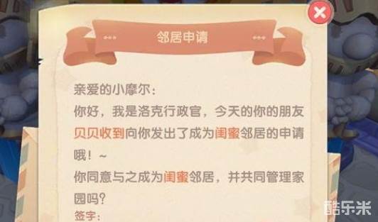 摩尔庄园和好朋友成为邻居其实很简单,只要满足几个条件就能开启这段有趣的互动。亲爱的小摩尔们需要确保双方都开启了邻居功能,这是最基础的要求。双方的好友亲密度要达到200点可以通过聊天、互赠礼物、帮忙浇水或一起跳舞来提升亲密度。记得去找摩尔城堡的行政官洛克提交申请,他会帮忙处理邻居协议的事情。下面和酷乐米小编一起来看看吧