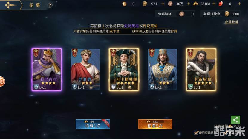 游戏中的英雄可以通过招募直接获得,也可以通过内城事件、航海事件等途径获得。游戏内打开招募系统,可以默认看到史诗招募和普通招募。