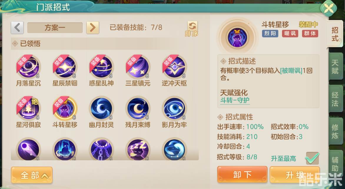 斗转星移:有概率使多个目标陷入被嘲讽状态,被嘲讽时招式将强制对自己释放。起到多封控场的效果,还能帮助自己积攒战气。
