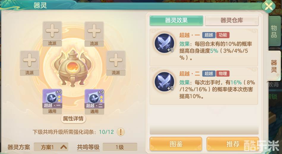 梦想世界器灵超越,属于通用流派器灵,能够有效提升角色的战斗能力,提高招式伤害、出招速度或额外增加本回合的出招数量。使用超越器灵,超越自身,获得超乎常人的能力,在战斗中发挥出令人意想不到的效果。下面和酷乐米小编一起来看看吧