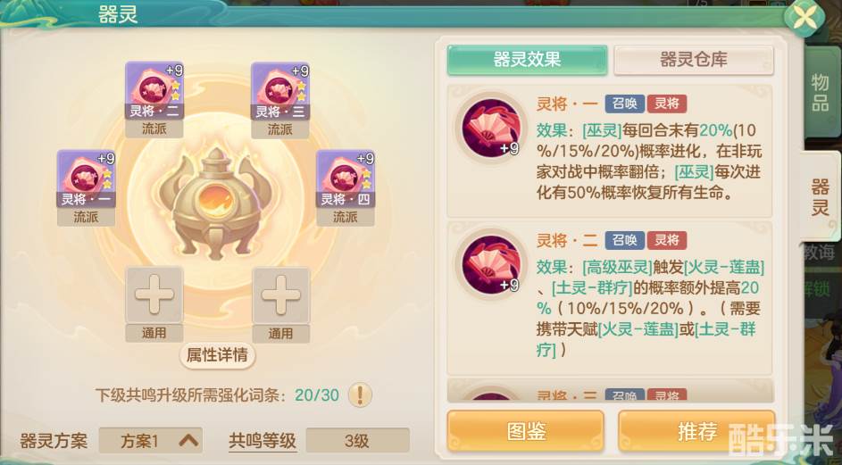 梦想世界器灵灵将属于巫法流派器灵,适合召唤专精的巫法使用。器灵-灵将主要适用于【巫灵】进化,能够在【巫灵】进化时触发不同的增益效果,例如恢复生命、额外出手等。使用该器灵,召唤英灵,统御战魂,激活古老契约中的不灭战意,与巫法共鸣,攻势如虹。下面和酷乐米小编一起来看看吧