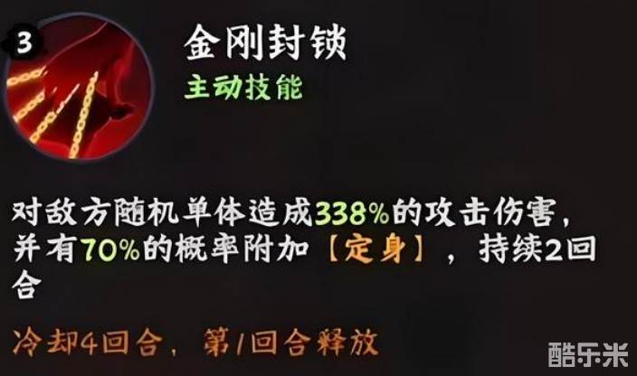 1、主动技能金刚封锁对敌方随机单位造成338%攻击力伤害,70%几率附加定身持续两回合,定身状态下敌方无法行动,且不会因受攻击解除,优于束缚效果。
