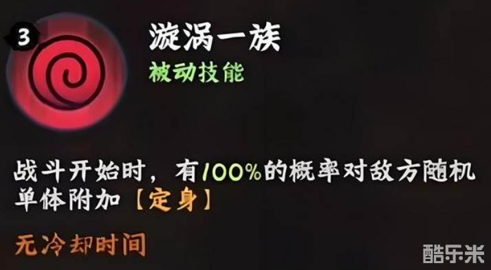 2、被动技能漩涡一族是核心,战斗开始时100%对敌方随机单位附加定身,持续两回合,高触发率可通过多次战斗尝试控住敌方核心,大幅提升胜率。