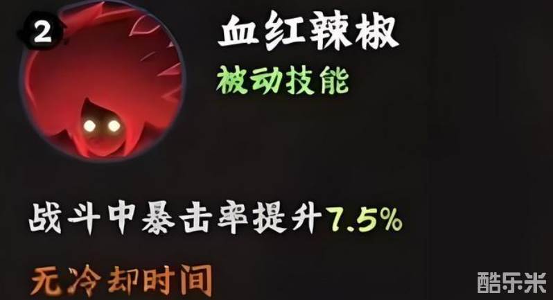 3、被动技能血红辣椒使战斗中暴击率提升7点5%,作用不大,因该忍者伤害不高且缺被动属性加成,适合作为控制工具人,融入前期阵容,适应平民玩家资源分配需求。