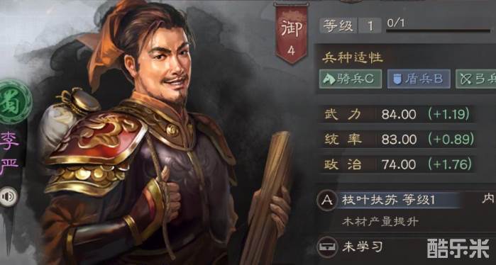 从武将定位来看,李严主要作为内政型武将使用,其自带战法枝叶扶苏能提升木材产量2%,适合委任为木材官。这使得他在游戏前期资源紧张阶段具有一定战略价值。虽然李严的兵种适性普遍较低(骑兵C、盾兵B、弓兵C、枪兵B、器械B),但其政治属性成长较为突出,50级时政治可达152点,在内政官员中属于中等偏上水平。