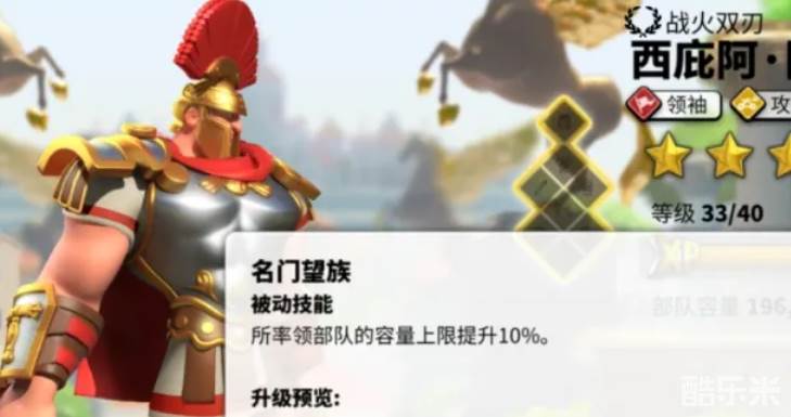 非洲征服者的被动直接增加了百分之7的攻城伤害,当玩家派他去攻城时就会触发。但是前期以发展为主,很少有玩家会主动攻城和其他玩家结仇,因此攻城用的不多。名门望族的被动可以增加百分之10的部队容量,这个增益对他很有帮助,因为他会经常受伤,部队容量的增加让他能够承受更高的伤害量。