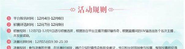 此次的选拔赛分为两个阶段,分别是是平台选拔赛和萌神争夺赛。在初赛评选期间,各位主播通过在各平台主播开播《轩辕传奇手游》,积累各自的uv值,在评选时间结束后,根据各自直播间的uv值选出各自名次的主播,并发放相应的奖励。平台选拔赛结束之后,初赛荣获前三名的主播将代表触手与全网主播竞选“萌神”。萌神争夺赛评选时间从12月15日19:30开始,21:30截止。主播通过在比赛时间段介绍《轩辕传奇手游》新职业御灵,号召粉丝到官网参与投票,最后根据粉丝的投票值来决定各位主播名次的先后顺序。
