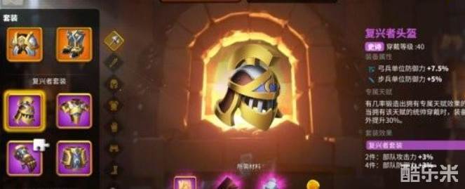 复兴套装作为紫色品质中的佼佼者,特别适合弓兵将领使用。这套装备的核心优势在于对弓兵属性的全面强化,四件套能提供15%攻击和18%防御加成,同时骑兵和步兵也能获得少量增益,但效果远不如弓兵显著。下面和酷乐米小编一起来看看吧