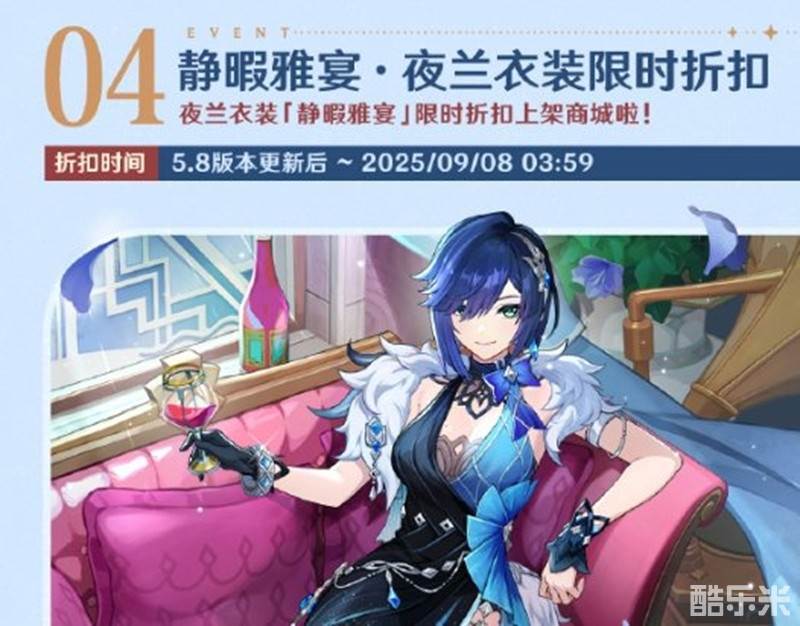 活动内容:夜兰衣装「静暇雅宴」限时折扣上架商城。折扣期间衣装售价为1350创世结晶,限时折扣结束后价格将恢复至1680创世结晶。上架期间限购1次。
