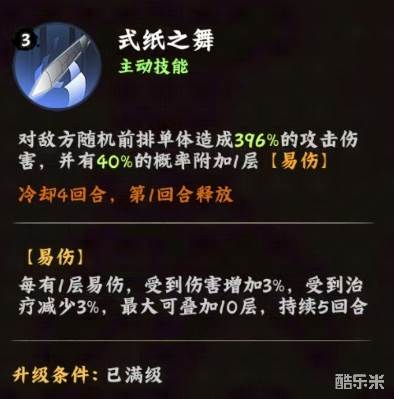 小南的主动技能叫做式纸之舞,可以对敌方随机前排单体造成396%的攻击伤害,并有40%的概率附加1层易伤状态,该技能冷却时间为4回合,且在第1回合即可释放,这属于一个高爆发单体伤害技能,达到396%的伤害系数意味着这一技能能够在短时间内对敌人的前排造成打击,尤其适合针对防御较高的坦克型角色,由于是随机选择目标,建议玩家根据实际战斗情况调整站位或利用其他控制技能来引导攻击方向。