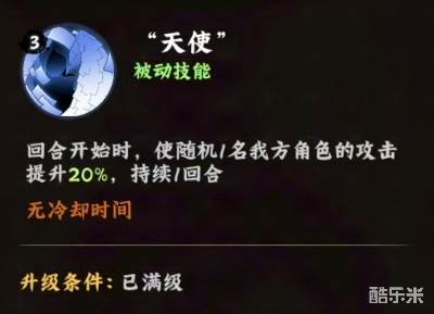 然后被动技能天使,效果是在回合开始时,使随机1名我方角色的攻击提升20%,持续1回合,无冷却时间。这个被动有着灵活增益机制,不同于固定给某个特定角色加攻的方式,天使技能采用了随机分配的方式,增加了队伍整体的不确定性和灵活性,这种设计鼓励玩家构建多样化的队伍配置,因为任何一名队员都有可能获得临时的属性提升。