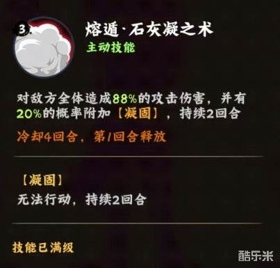 想要了解黑土大家就要先看黑土的主动技能,叫做熔遁石灰凝之术,此技能一旦发动,将对敌方全体目标造成相当于自身攻击力88%的伤害打击,虽说从伤害数值上看并非顶尖突出,但它却拥有着极为可观的攻击范围覆盖优势,更为关键的是,该技能还附带了20%的几率使敌人陷入凝固状态,且这一负面效果将持续两回合之久,当敌人不幸被凝固后,将完全无法行动。
