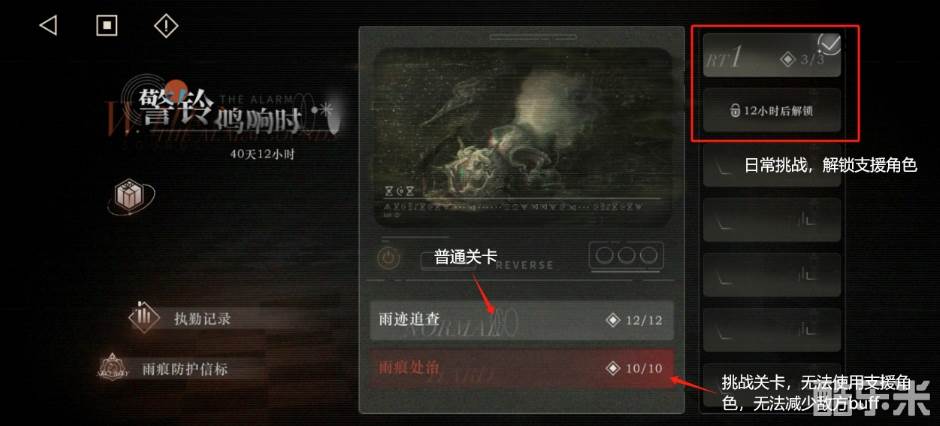 警铃鸣响时主要分为三个关卡,通关能拿到材料以及雨痕防护信标。像信标能进行支援角色的解锁,助力低练玩家往前推进。其中雨痕追查的难度会更低一些,而雨痕处治会有一定的压力。追查中先进行四个小关的挑战,打完之后派遣一名进行观测就行。这样另一个敌怪的buff就会减少,若没有减少它会累积到下一关卡。四小关全部打完并达成模范执勤标准后,最终的boss就会出现。第一小关是左上的现场封锁行动,需保证里面的小boss两回合不动。
