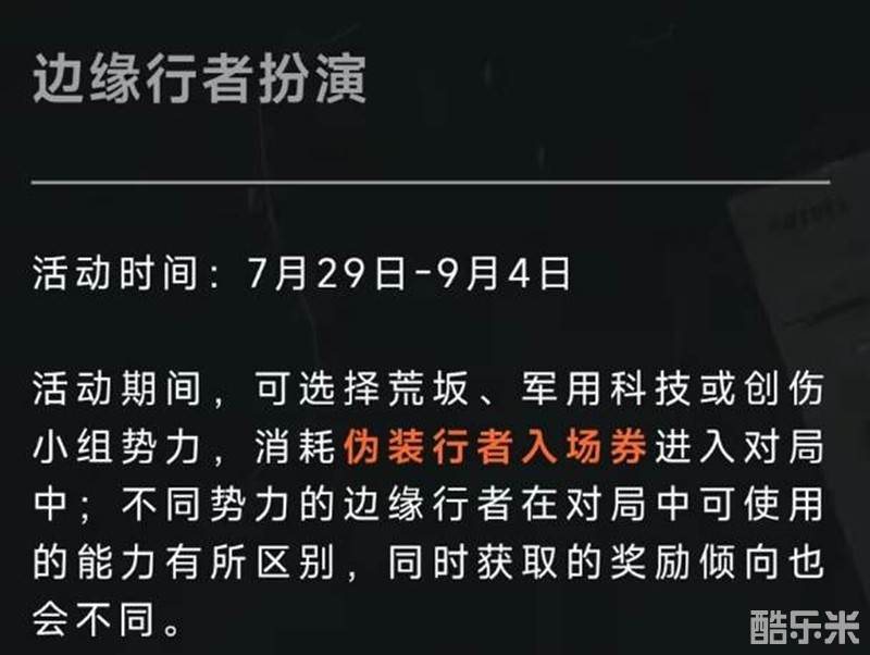 玩家可以选择荒坂、军用科技或创伤小组势力,消耗伪装行者入场券进入对局。不同势力的边缘行者在对局中可使用的能力有所区别,同时获取的奖励倾向也会不同。