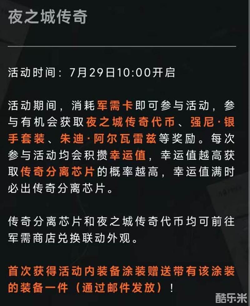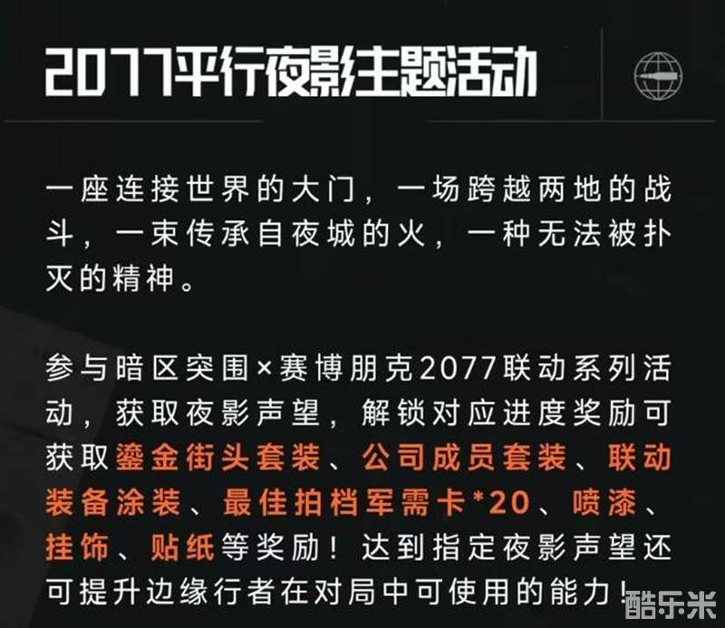 暗区突围赛博2077联动活动有哪些?暗区突围与赛博朋克2077的联动活动将于7月29日正式上线~很多小伙伴都在关心本次联动有哪些活动,哪些福利?下面和酷乐米小编一起来看看吧